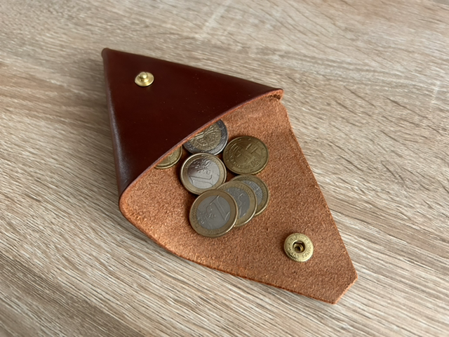 Un porte-monnaie en cuir de bœuf/taureau, de forme triangulaire, qui se glisse très facilement dans la poche et vous accompagne partout. Les boutons pressions sont en laiton massif. Il est ici proposé dans un coloris “Acajou”.